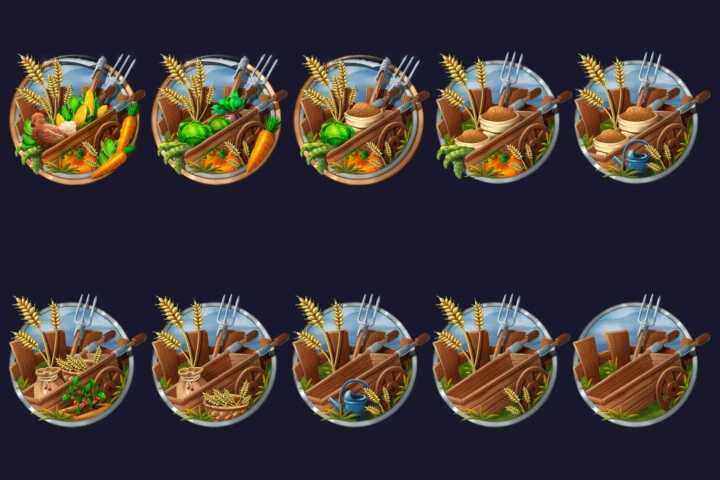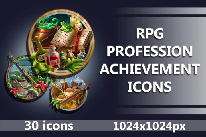 30个高清2D游戏钓鱼、耕作和药水制作成就图标素材,这套图标将帮助您丰富玩家完成特定任务后获得的奖励。这里有 30 个优质图标: