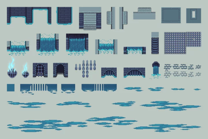 打开文件后,您将发现大量关卡图块(墙壁、桥梁、特殊高地、拱门、转弯和其他石质结构)。此外,您还能找到一些互补元素,它们各自拥有专属的动画效果,包括水面及其眩光、小型排水沟、陷阱、格栅、大门、火把以及许多其他细节。